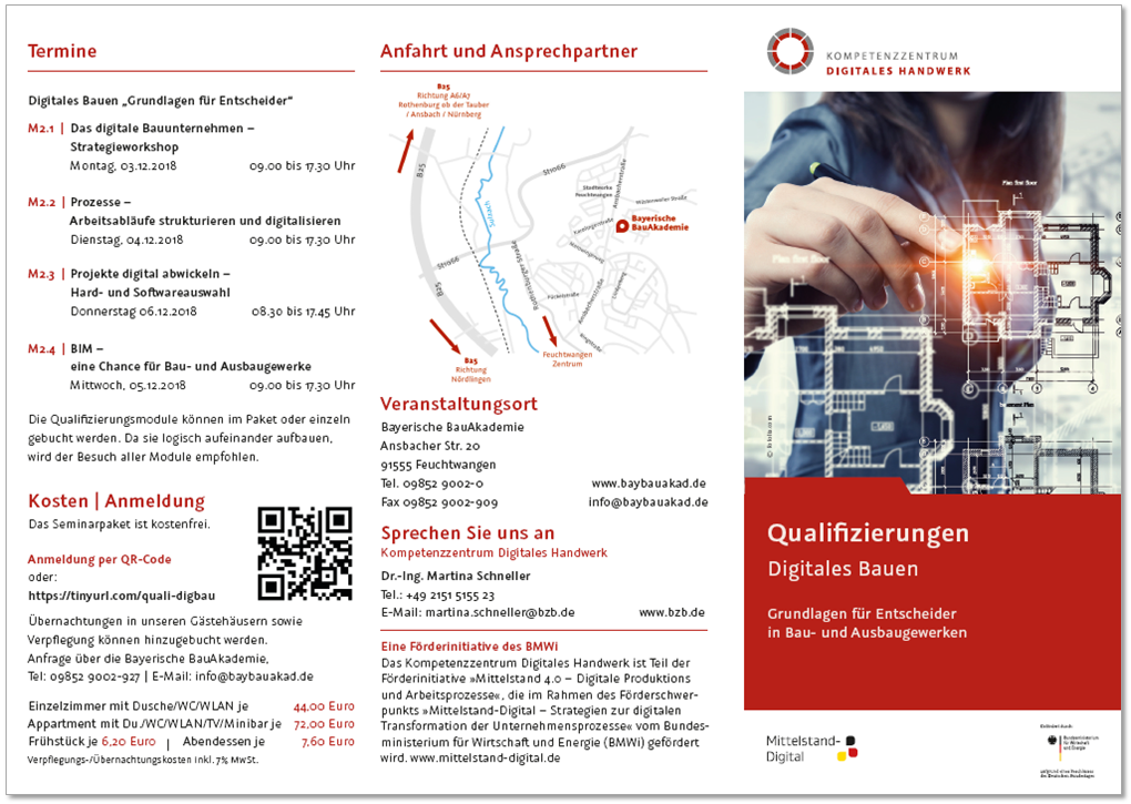 Feuchtwangen, November 2018 - Das Schaufenster Digitales Bauen des Kompetenzzentrums Digitales Handwerk - www.handwerkdigital.de - hat mit der Reihe "Grundlagen für Entscheider" ein Qualifizierungspaket zum Thema digitales Bauen entwickelt, das als Seminarpaket mit vier kostenfreien Modulen vom 03. bis zum 06. Dezember 2018 in der Bayerischen BauAkademie angeboten wird... > weiterlesen